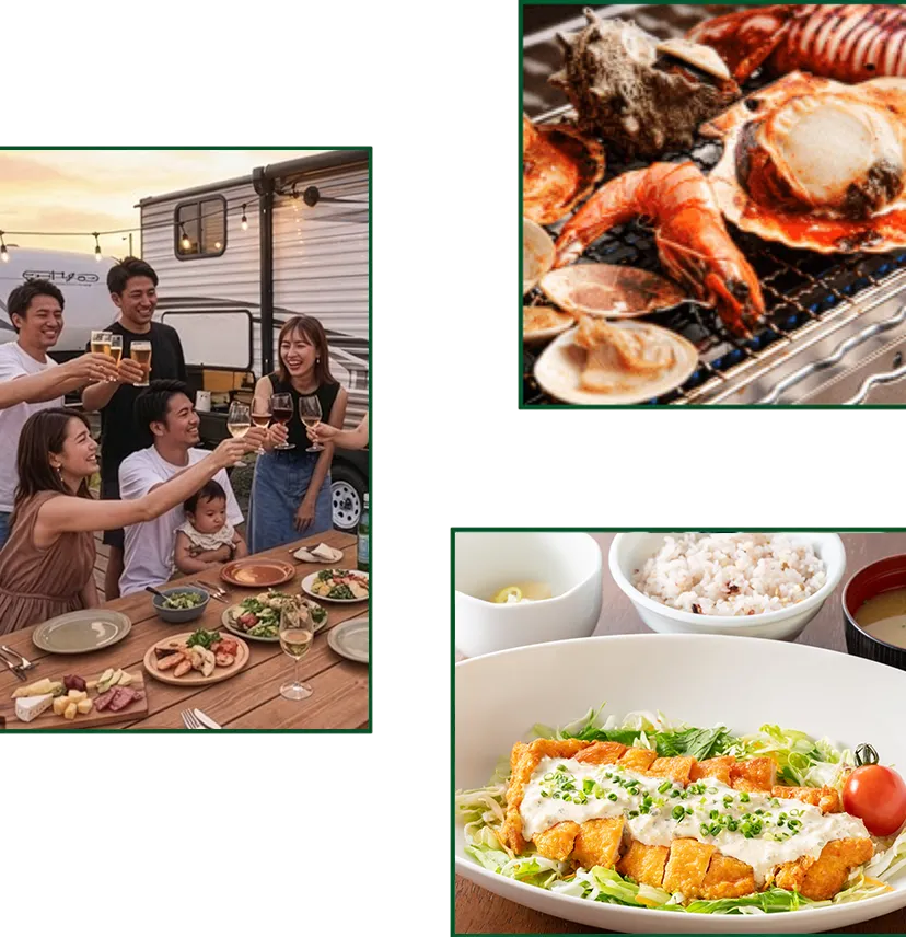 近くのスーパーなどで購入したお料理を持ち込んだり、キッチン付きの設備充実のトレーラーハウスなので、お好きな食材で仲間や家族とわいわい料理するのも良し!併設されている「最高の湯」のお食事処で食事をすることも可能。